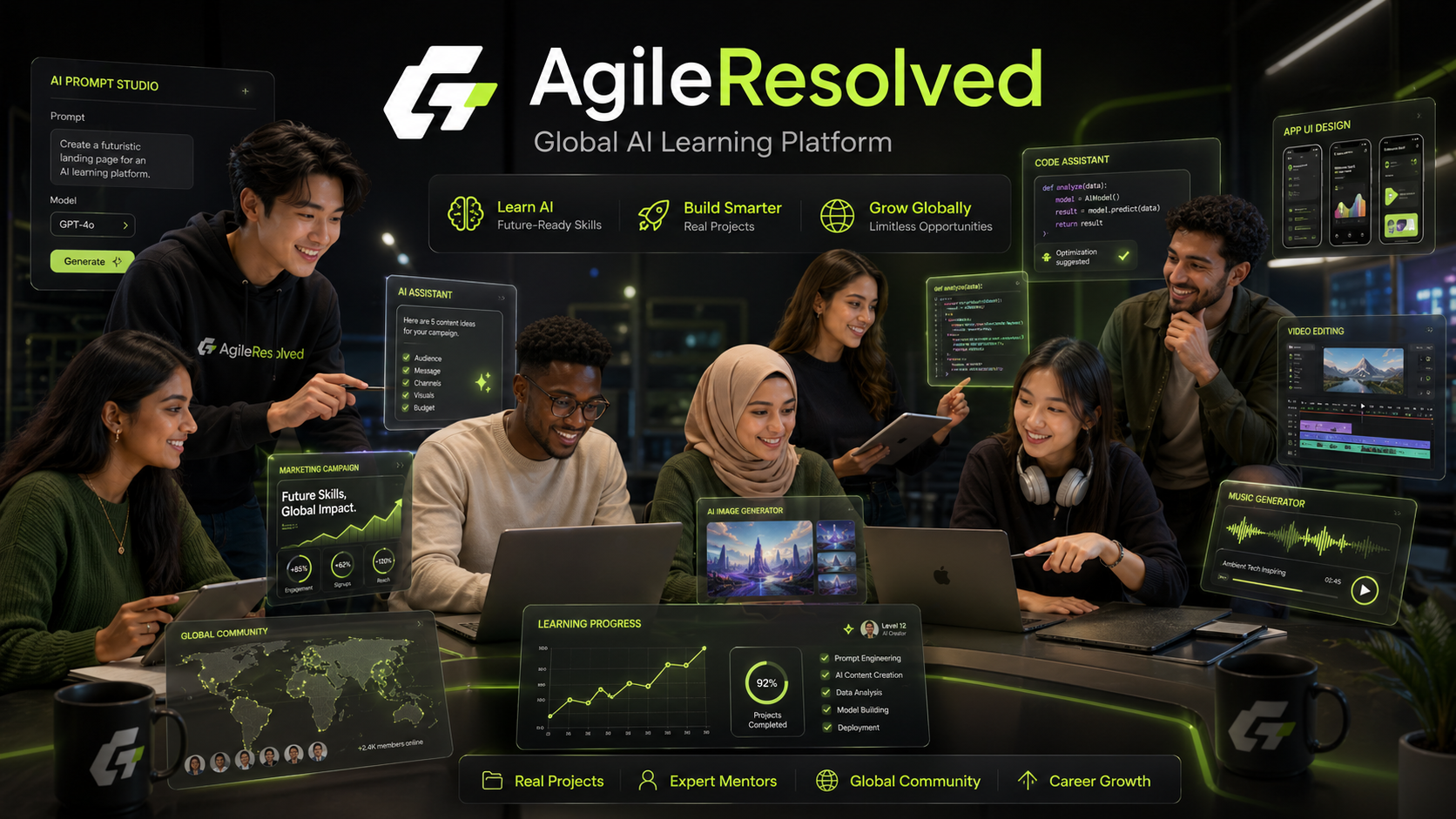 AgileResolved is a global AI learning platform helping students, professionals, creators, freelancers, entrepreneurs, and businesses master practical AI skills for the future of work.