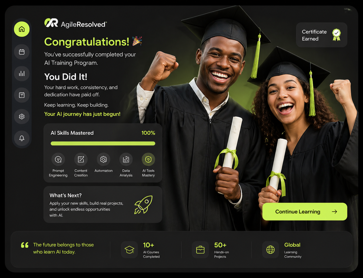 The future belongs to people who can use AI wisely. Join AgileResolved today and start learning practical AI skills that can help you create, work, earn, teach, build, and grow from anywhere in the world.